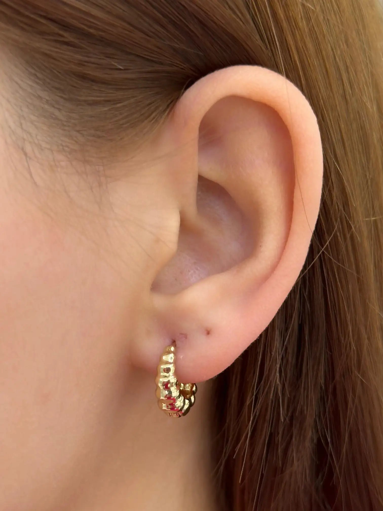 Organik baloncuk/pebble dokusuyla ışığı çok yönlü yakalayan modern mini halka. ✨ Gold ışıltı kulağa sıcak bir vurgu katar; menteşeli huggie kilidiyle tek hamlede takılır ve gün boyu konfor sağlar. Tek başına dikkat çekici, çoklu piercing kombinlerinde harika tamamlayıcı!