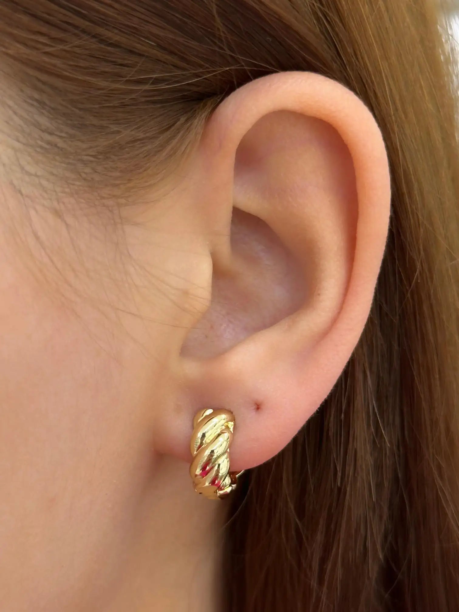 Kalın burgu/halat kıvrımıyla hacimli ve ışıltılı bir görünüm sunan modern mini halka. ✨ Gold ton sıcak bir parıltı verir; menteşeli huggie kilidiyle kolayca takılır ve gün boyu konfor sağlar. Tek başına statement, çoklu piercing kombinlerinde harika tamamlayıcı!