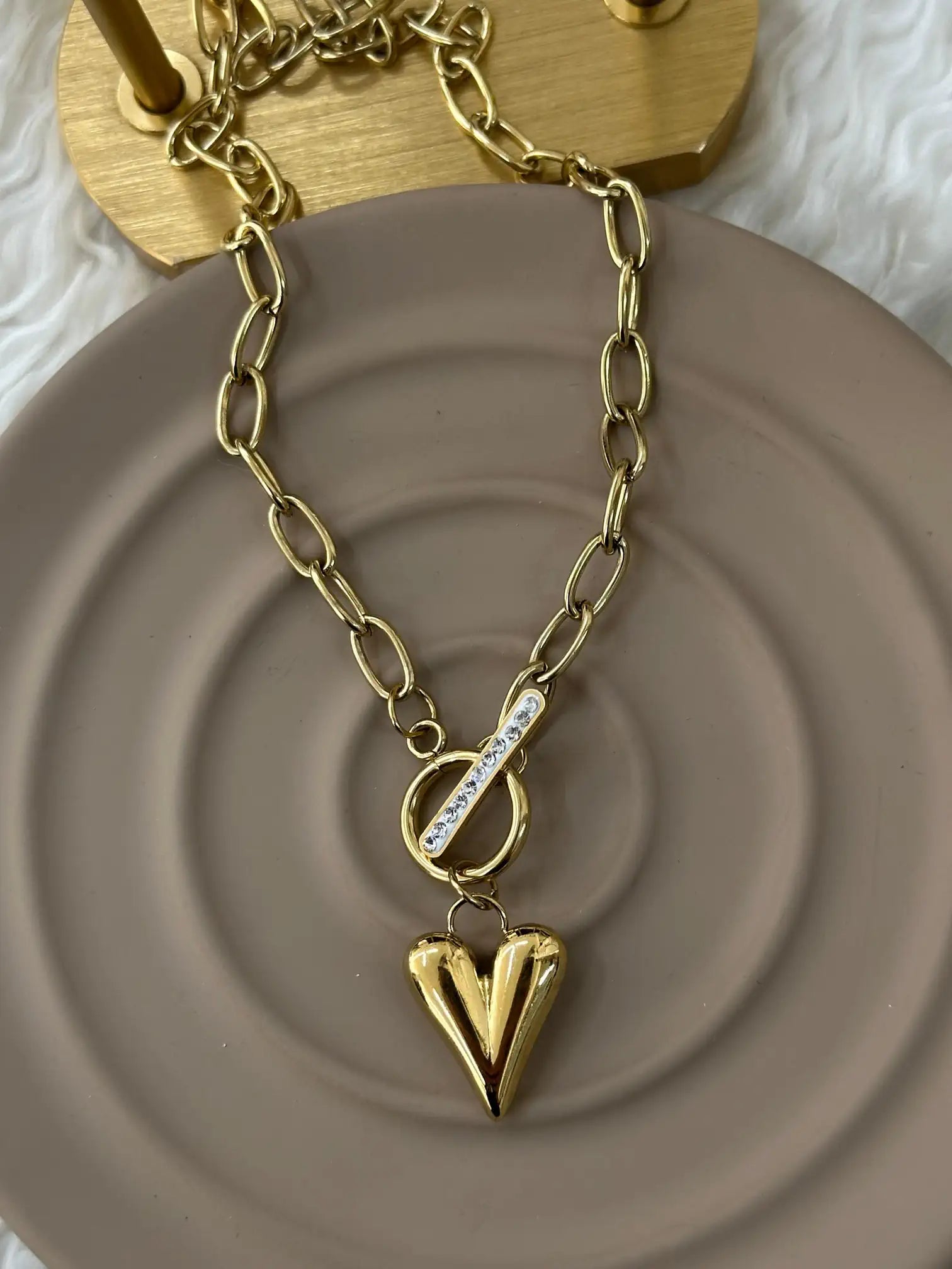 Minimalist ve iddialı çizgileri bir araya getiren bu kolye, parlak altın renkli paperclip formundaki zincirin ortasında yer alan zirkon taşlı T-bar akor ve sallantılı kalp detayıyla zamansız bir şıklık sunuyor. Hem gündelik kombinlerinize güçlü bir vurgu katacak, hem de gece davetlerinde zarif bir ışıltıyla öne çıkmanızı sağlayacak.
