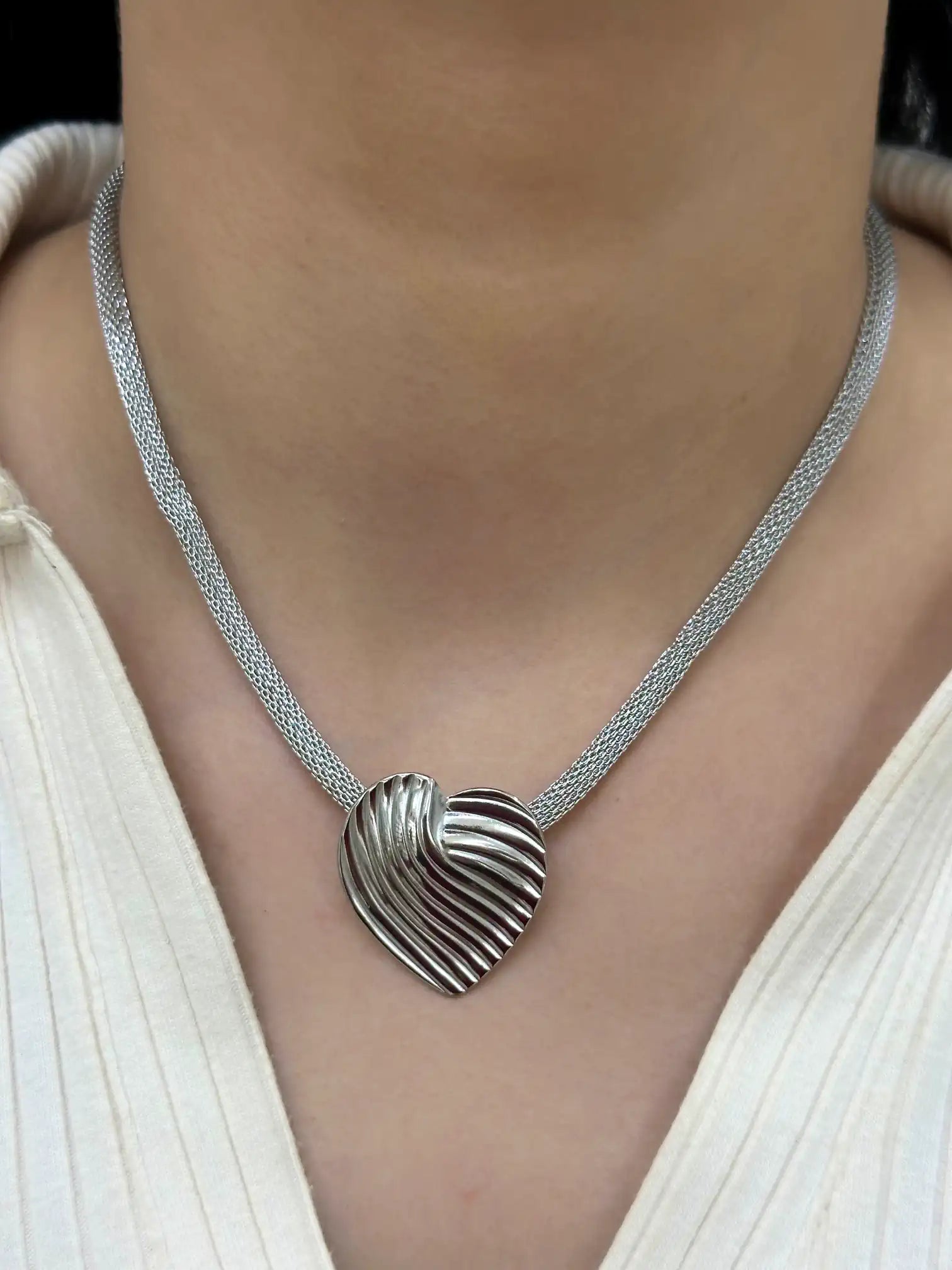 Modern tasarımıyla dikkat çeken bu kalp kolye, zarif çizgilerle hareketlendirilmiş yüzeyiyle şıklığı ve sadeliği bir araya getiriyor. Kalp figürünün iki farklı dokusu, kolyeye dinamik ve estetik bir görünüm katarken, kaliteli metal yapısı uzun süre kullanım sağlar. İnce örgü zincir ile tamamlanan bu kolye, günlük kullanımdan özel davetlere kadar her ortamda stilinize sofistike bir dokunuş ekler. Kendiniz için ya da sevdiklerinize anlamlı ve şık bir hediye seçeneği olarak tercih edebilirsiniz. Modern ve minimal tasarımıyla her tarza uyum sağlar.