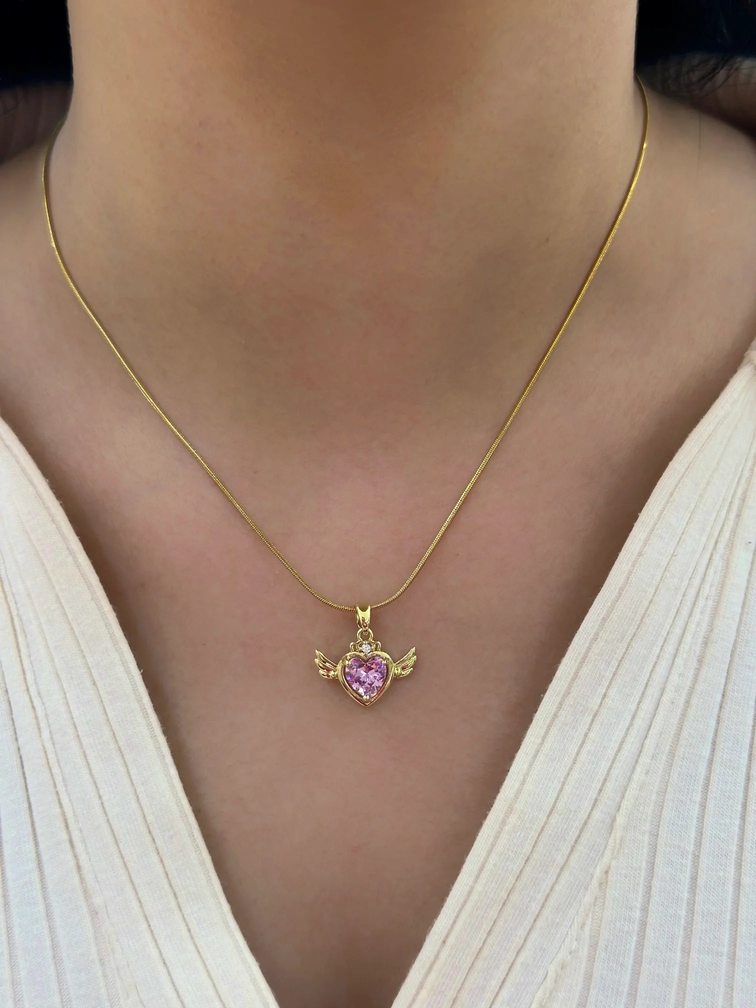 Kanatlı Kalp Kolye, romantik ve feminen bir dokunuş taşıyan özel bir tasarım. İnce yassı zincirin ucunda sallantılı olarak duran kalp formundaki pembe taş, canlı rengiyle enerjinizi yükseltir. Kalbin iki yanındaki minyatür kanat figürleri, özgür ruhu simgeleyerek kolyeye masalsı bir hava katar. Üst kısmındaki küçük zirkon taş detayları, tasarıma ince ışıltılar ekler. Hafif yapısı ve ayarlanabilir zinciri sayesinde hem gündelik jean-tişört kombininize hem de şık gece elbisenize kolayca uyum sağlar. Kendiniz veya sevdikleriniz için anlamlı bir hediye alternatifi olan , her bakışta zarif bir izlenim bırakacak.