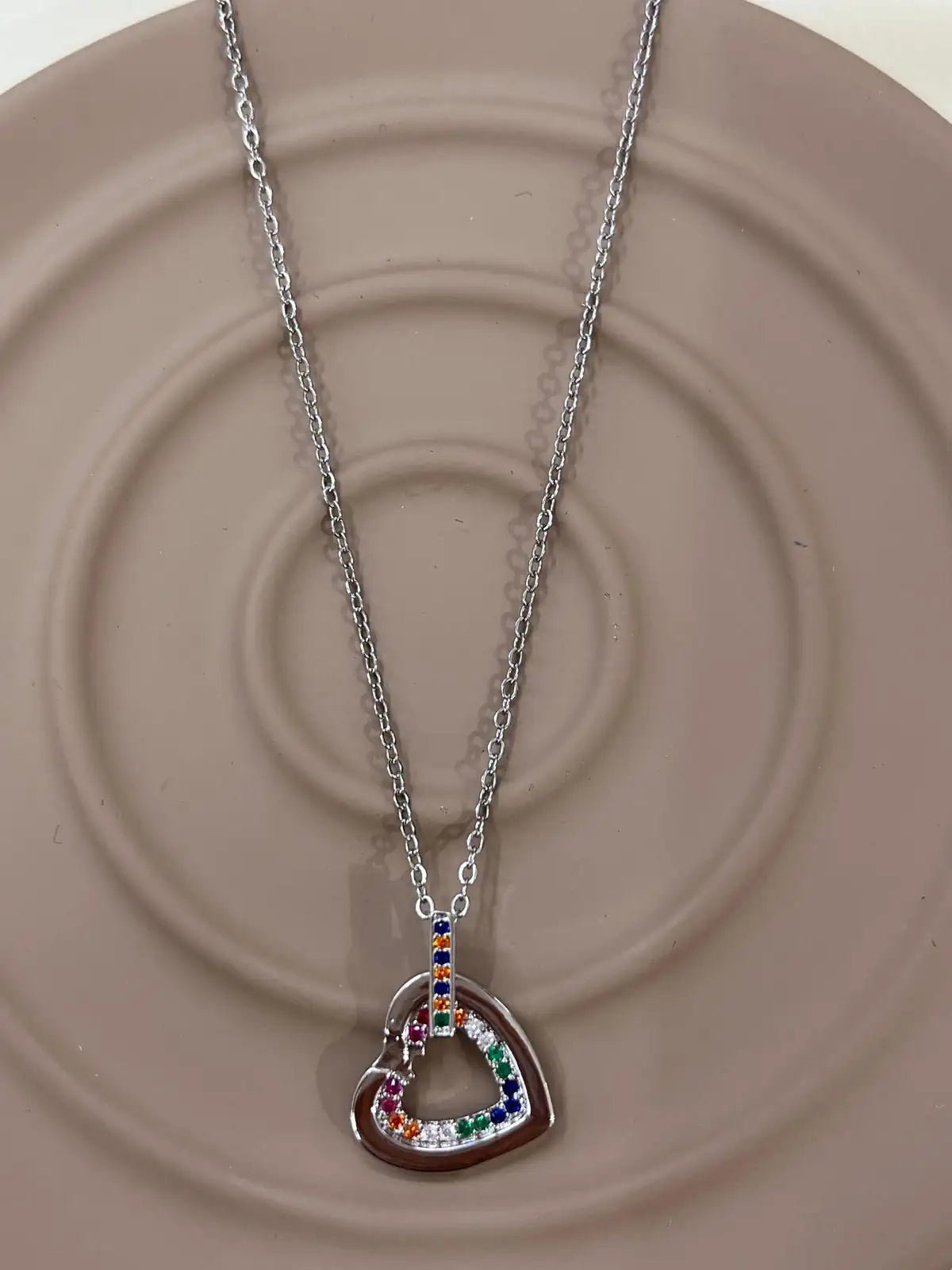 Zarif kalp formundaki kolye ucu, ince bir çelik zincir üzerine asılmıştır. Kalbin iç yüzeyi, parlak zirkon taşlarla gökkuşağının tüm renklerini yansıtarak ışıldar. Her taş özenle seçilmiş olup, kolyenize neşeli ve dinamik bir dokunuş katar. 45 cm zincir uzunluğu, 5 cm’lik uzatma halkasıyla kişisel tercihlerinize göre ayarlanabilir. Günlük şıklığınızda duru bir canlılık arayanlara ve özel davetlerde incelikli bir renk patlaması yaşatmak isteyenlere ideal!