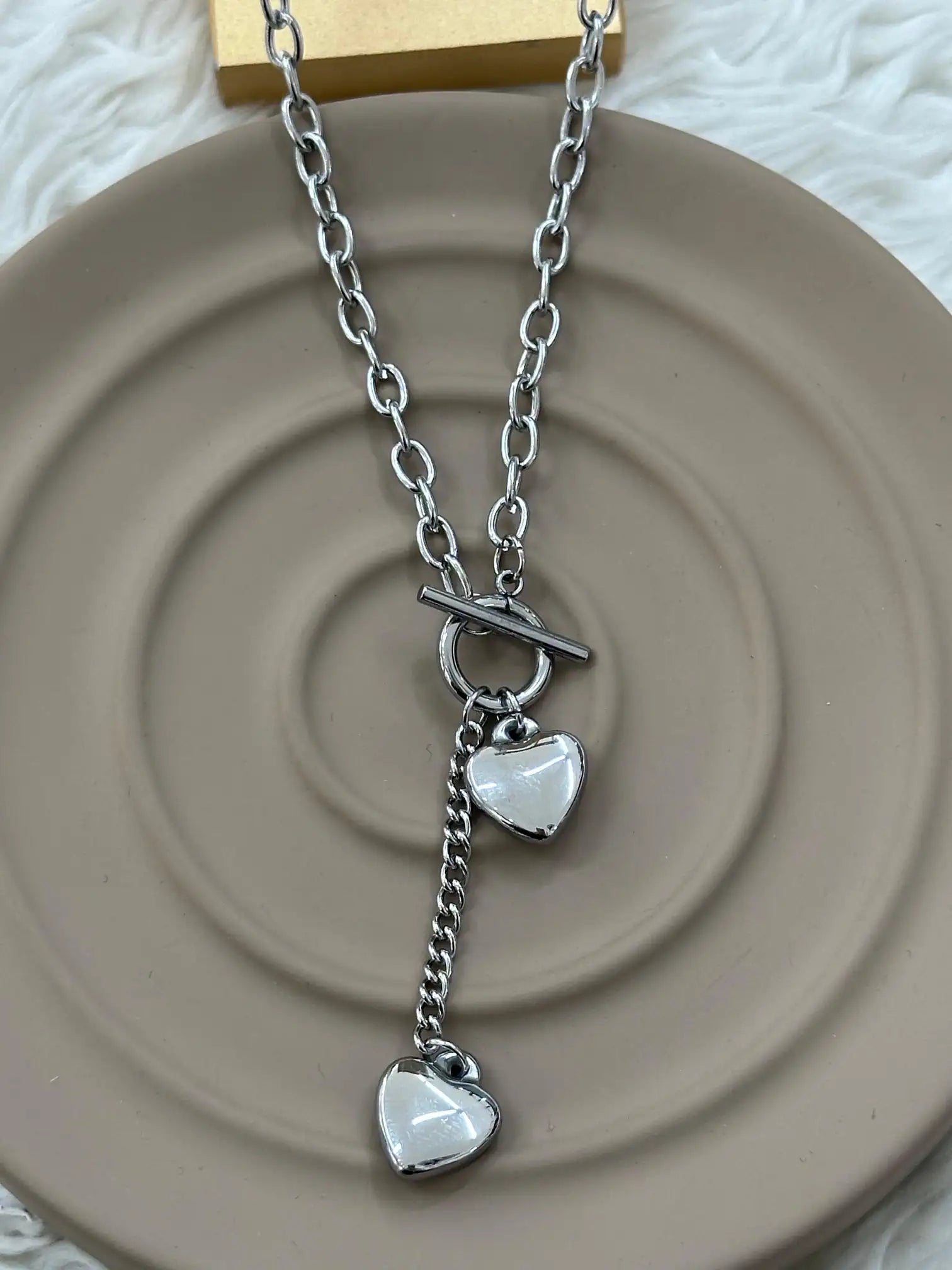 Parlak gümüş renginde çelikten üretilmiş bu şık kolye, kalın halka halkalı zinciri, T-bar (çubuk) kilit detayını ve iki farklı boydaki nazik sallantılı kalp madalyonlarıyla fark yaratır. Zincirin uzunluğu 45 cm olup, T-bar kilit üzerinden birkaç santimetre uyarlama yaparak 40–50 cm arası kullanım sağlar.