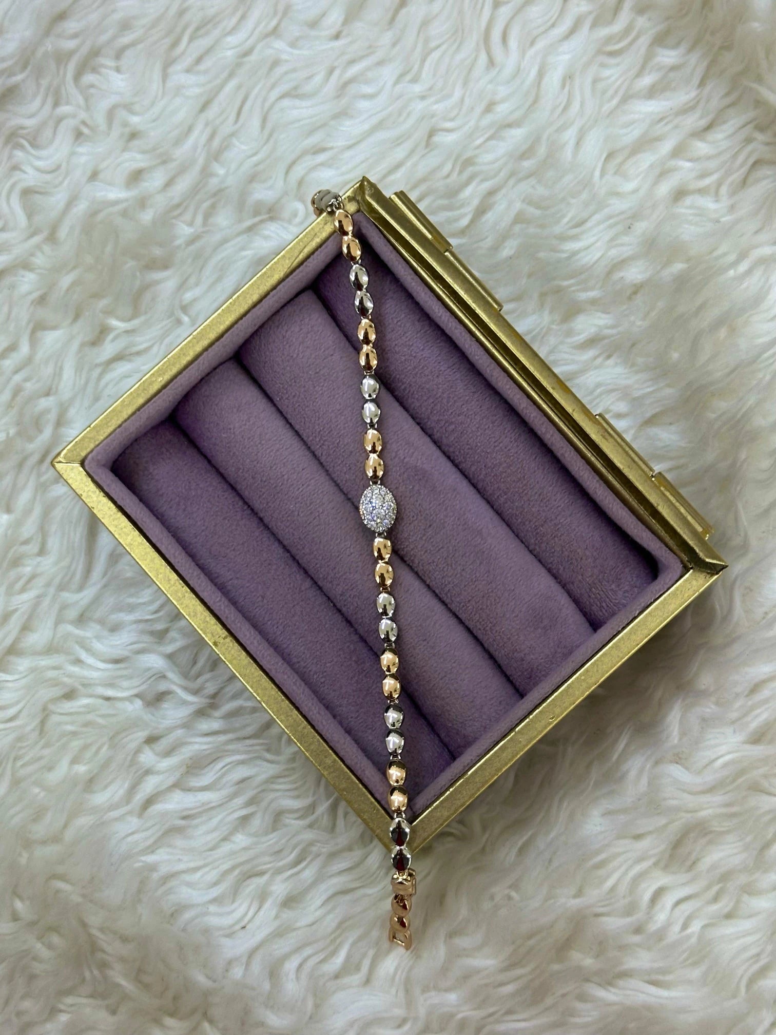 Modern ve şık tasarımıyla dikkat çeken bu bileklik, çift renkli oval kesim taşları ile zarafet ve stilinizi bir araya getiriyor. Rose gold ve beyaz altın tonlarının uyumuyla özel günlerde ve günlük kullanımlarda ışıltınızı tamamlayacak ideal bir aksesuar. İnce işçilik ve kaliteli materyal kullanımıyla uzun ömürlü ve dayanıklıdır. Minimalist ama etkileyici tasarımıyla her kombinin vazgeçilmezi olacak.
