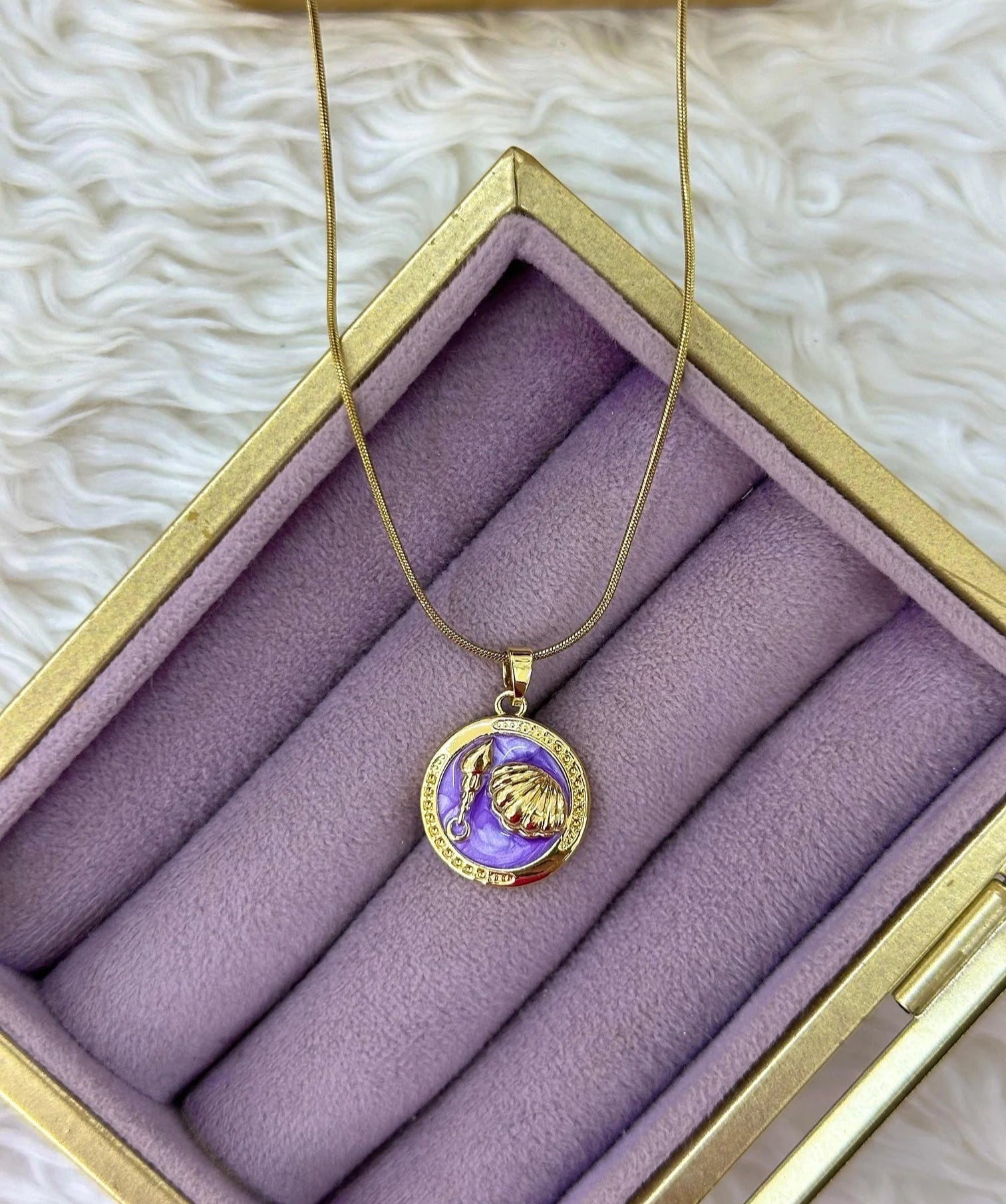 Etrafınızdaki güzellikleri yansıtan bu zarif kolye, mor zemin üzerine yerleştirilmiş minyatür bir deniz kabuğu ve sanat fırçası detaylarıyla dikkat çekiyor. Altın rengi çerçevesi ve parıldayan taşlarıyla her ortamda şıklığınıza sofistike bir dokunuş katan bu parça, hem günlük kullanıma hem de özel davetlere uygun benzersiz bir aksesuar. Sanat ve doğanın birleştiği bu özel kolye, kendinizi ifade etmenin zarif yolu olacak