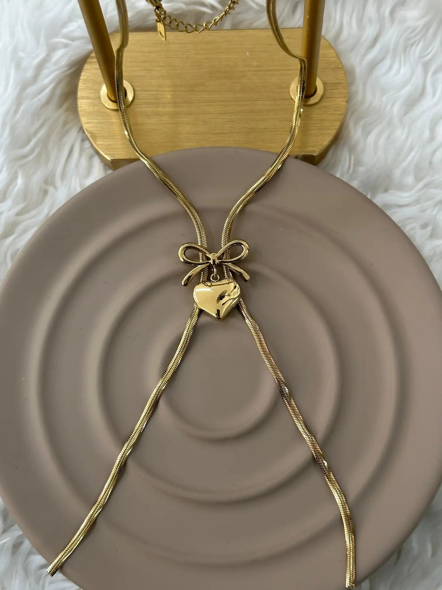İnce yılan zinciri üzerinde, nazlı bir fiyonk ve hemen altında ayna parlaklığında sallanan kalp detayıyla romantik bir şıklık sunan Fiyonklu Kalp Süzülüşü Lariat Kolye, akışkan lariat tasarımıyla boynunuzda zarif bir düşüş yaratır. Hem günlük stilinizi feminen bir dokunuşla zenginleştirmek, hem de özel davetlerde ışıltınızı öne çıkarmak için ideal.