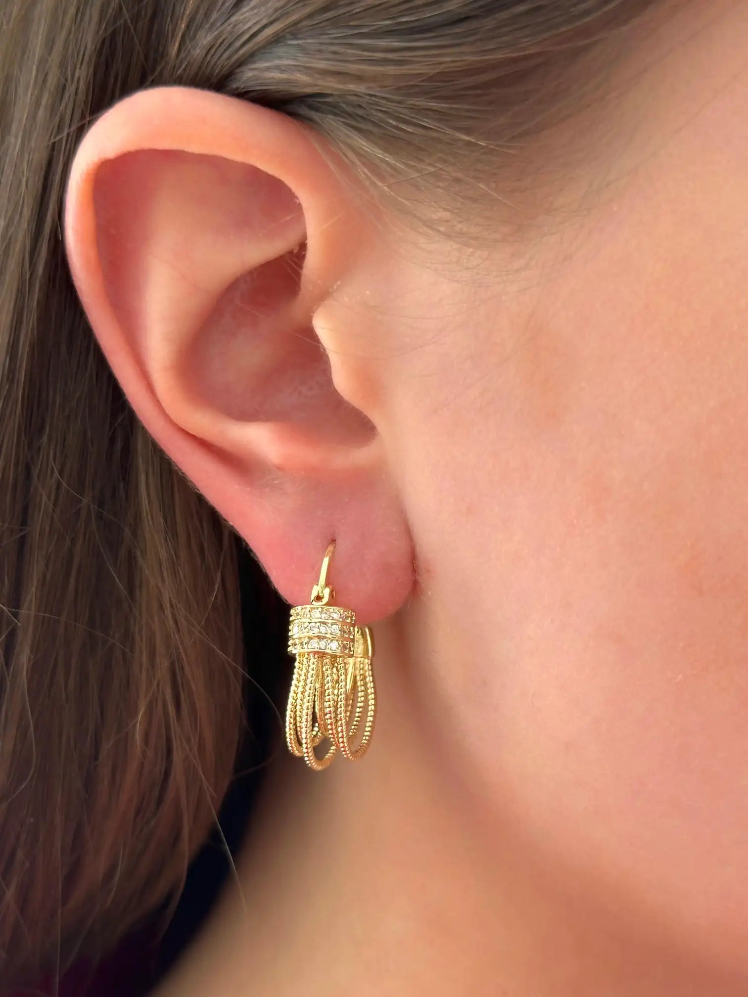 Şık ve modern tasarımıyla öne çıkan Altın Zincir Halkalı Işıltılı Küpe, çoklu ince halka formu ve taşlı üst detayıyla dikkat çekiyor. Parlak altın tonuyla harmanlanan zarif detaylar, ışığı yansıtarak her kombinle göz alıcı bir uyum sağlar.