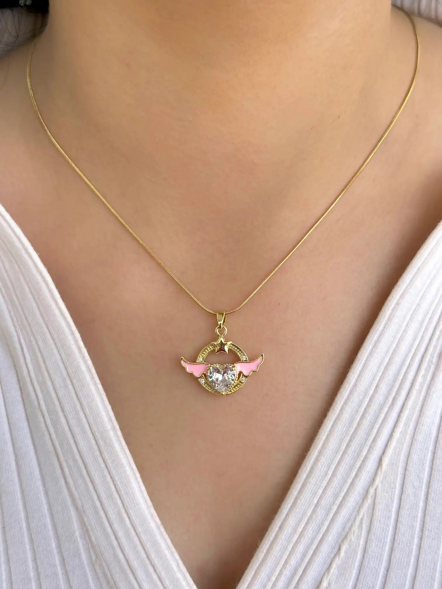 Gold Renkli Pembe Kanatlı Kalp Kolye