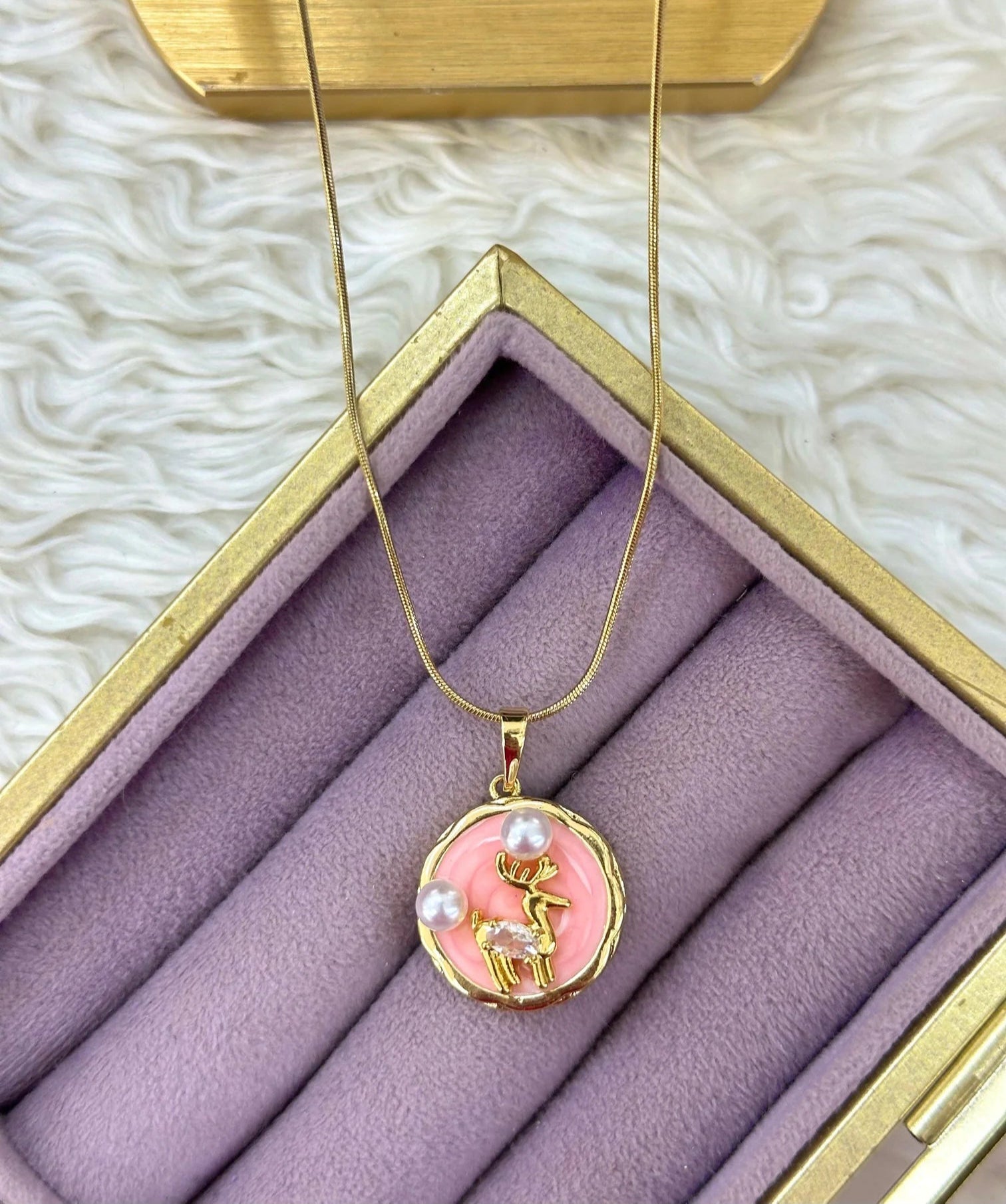 Romantik ve zarif tasarımıyla dikkat çeken İnci Geyik Kolye, pembe zemin üzerinde yer alan ince detaylarla süslenmiş geyik figürü ile özgünlüğünü ortaya koyuyor. Altın kaplama çerçeve ile çevrili olan bu özel aksesuar, doğal incilerin parlaklığı ve şıklığıyla her kombinize zarif bir dokunuş katacak. Hem günlük kullanıma hem de özel günlere uygun olan bu kolye, stilinizi tamamlamak için ideal bir seçimdir. Kendiniz veya sevdikleriniz için anlamlı ve şık bir hediye alternatifi!