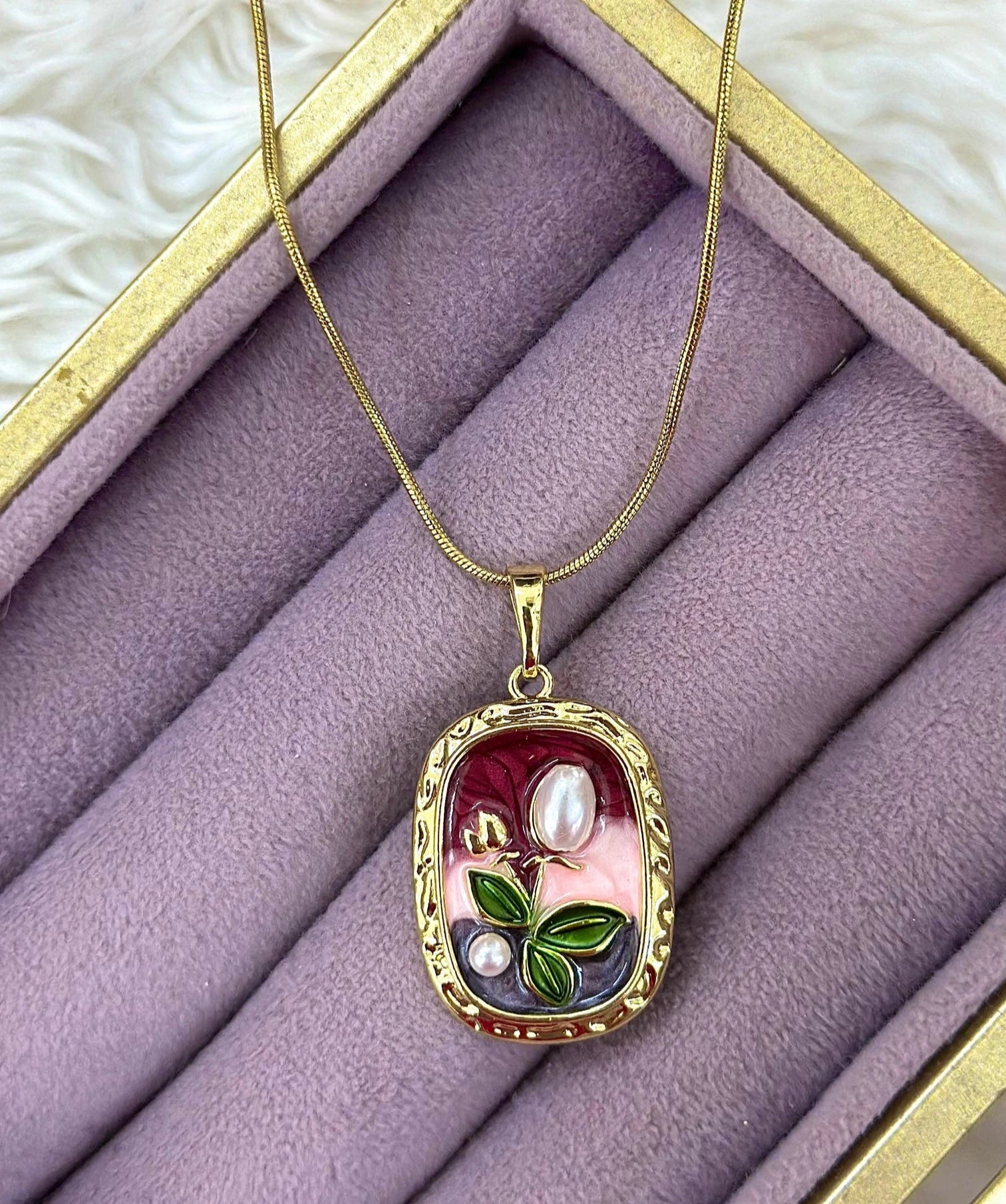 Romantik ve göz alıcı Kızıl Gün Batımı Kolye, altın kaplama çerçevesi ile göz kamaştırıyor. Derin kırmızı, pembe ve diğer renklerin harmanlandığı arka plan üzerinde, doğal inciler ve canlı yeşil yaprak detayları zarifçe yer alıyor. Bu özel tasarım kolye, her ortamda dikkat çekmenizi sağlayacak, kişisel stilinize sıcak bir dokunuş katacaktır. Günlük kullanımdan özel davetlere kadar tüm kombinlerinize uyum sağlayacak bu eşsiz parça, sevdiklerinize de anlamlı bir hediye seçeneği sunuyor.