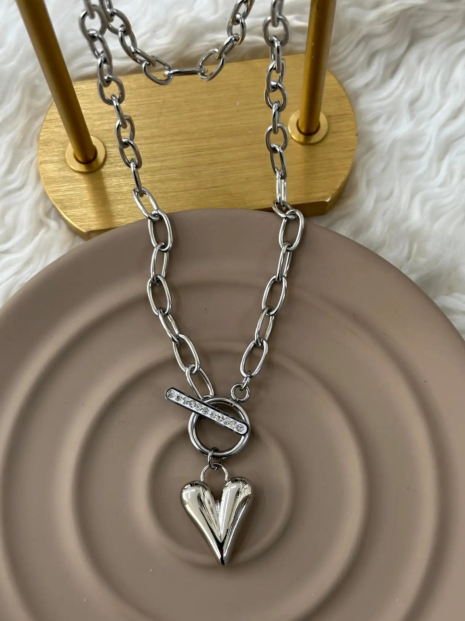 Modern ve göz alıcı bir stil sunan Kristal Bar Kalp Zincir Kolye, kalın oval bağlantılı çelik zincirin ortasında yer alan taşlı T-bar akor ve altından ağır asılı büyük kalp figürüyle güçlü bir duruş sergiliyor. Gümüş rengi çeliğin parlak yüzeyi, zirkon taşlı bar detayı ve metal kalp motifiyle her kombinde iddialı bir vurgu yaratır.