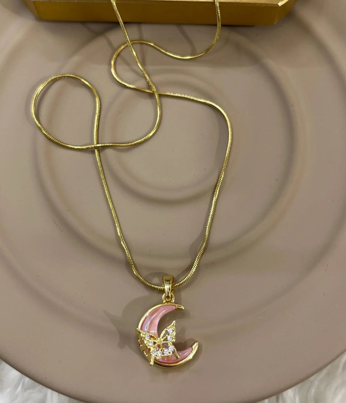 Pembe Mineli Ay ve Kelebek Çelik Kolye