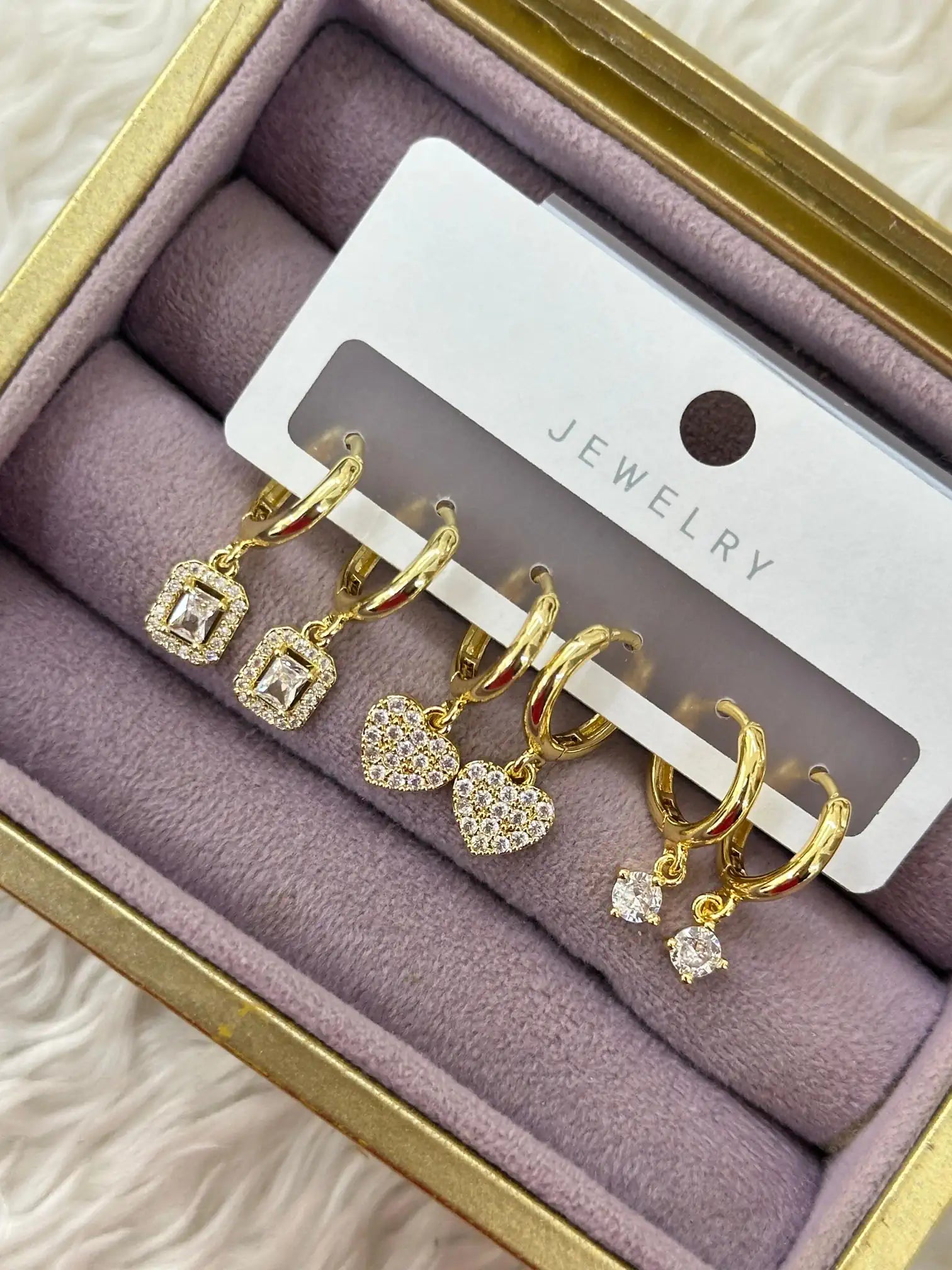 VIP Altın Renkli 3’lü Taşlı Charm Küpe Seti