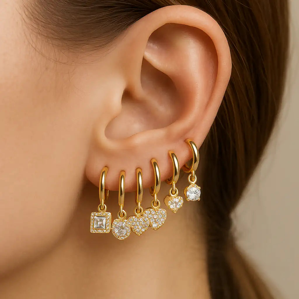 VIP koleksiyonuna ait bu 3’lü charm küpe seti, zarif ve parlak tasarımlarıyla dikkat çeker. Set; kare kesim taşlı çerçeve model, zirkon taşlı kalp charm ve tek taşlı klasik halka küpeden oluşur. Her bir model, ışığı mükemmel yansıtarak hem günlük hem özel kombinlerde şık bir dokunuş sağlar.