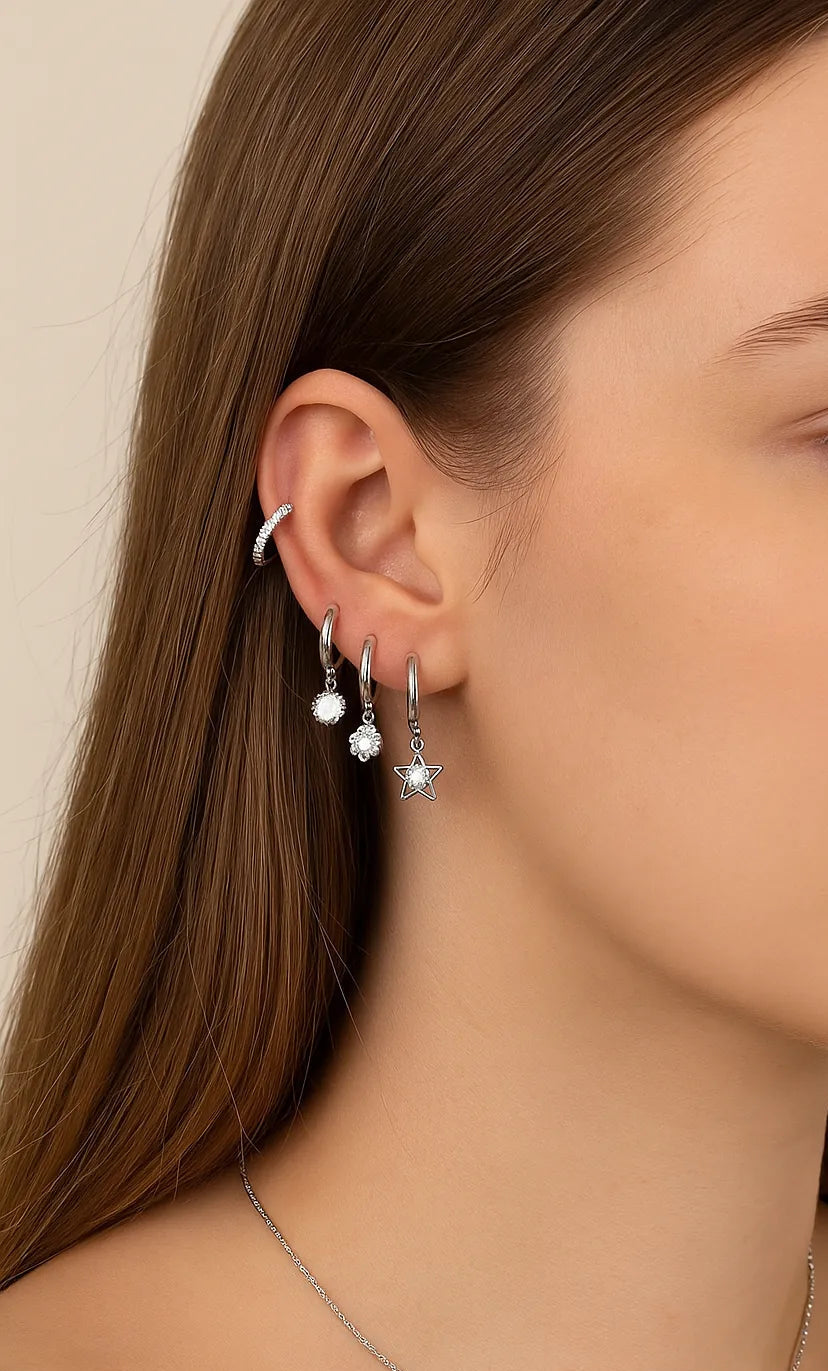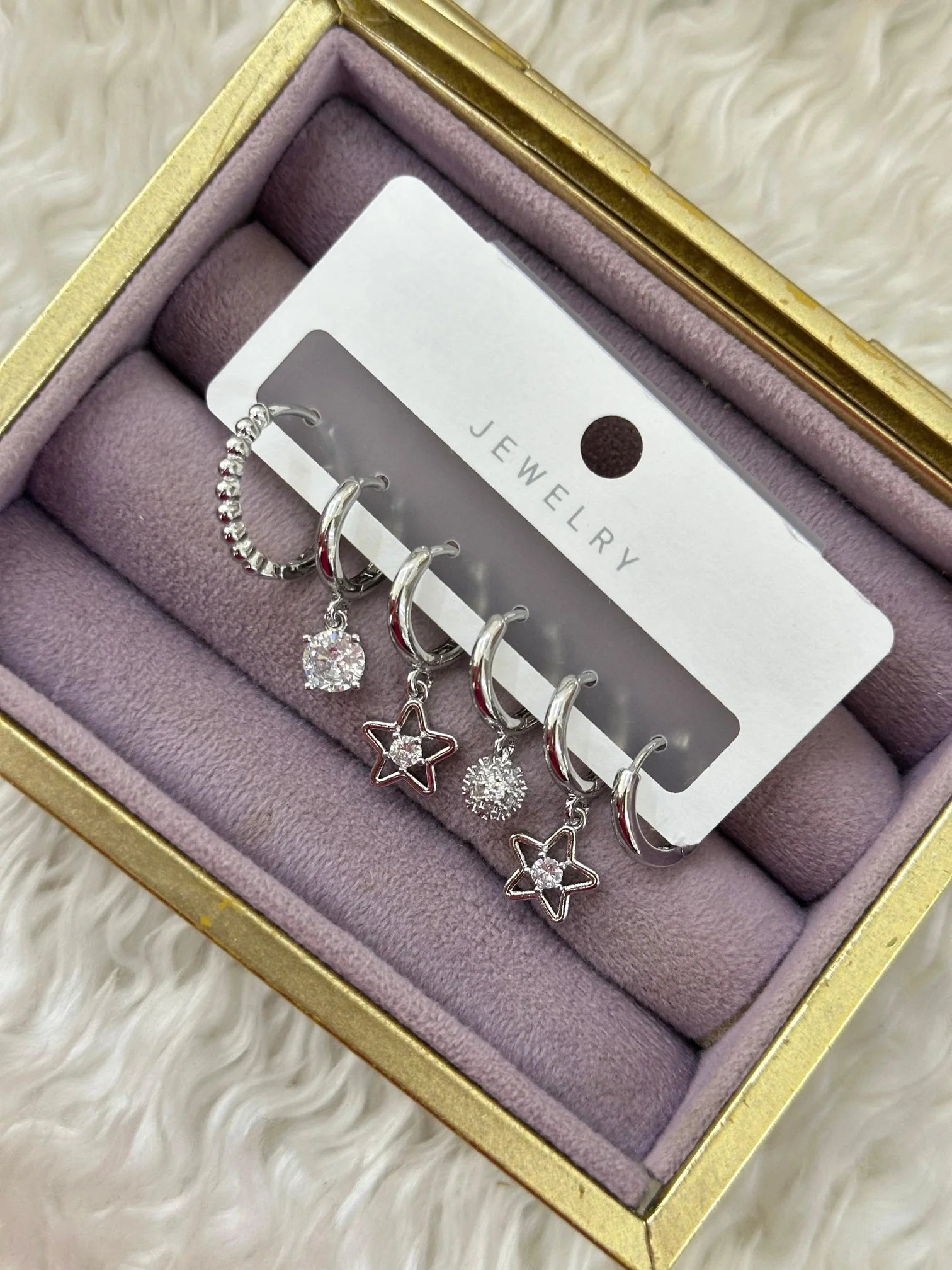 VIP Gümüş Renkli 6’lı Yıldız ve Taş Detaylı Halka Küpe Seti