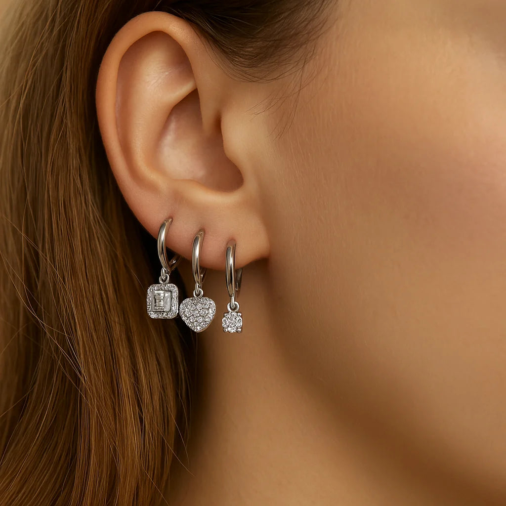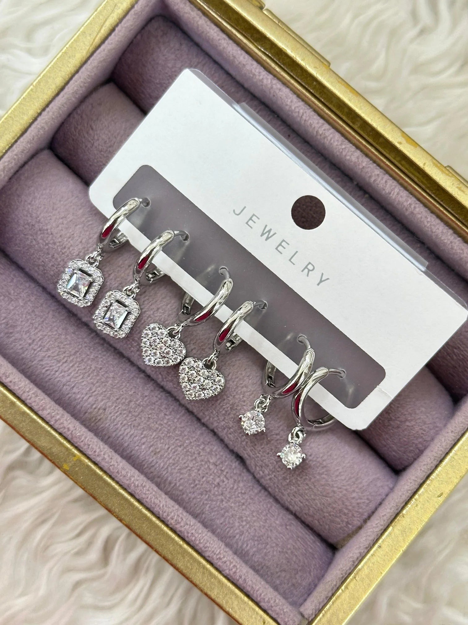 VIP Gümüş Renkli Taşlı Kare, Kalp ve Tektaş Figürlü 6’li Küpe Seti