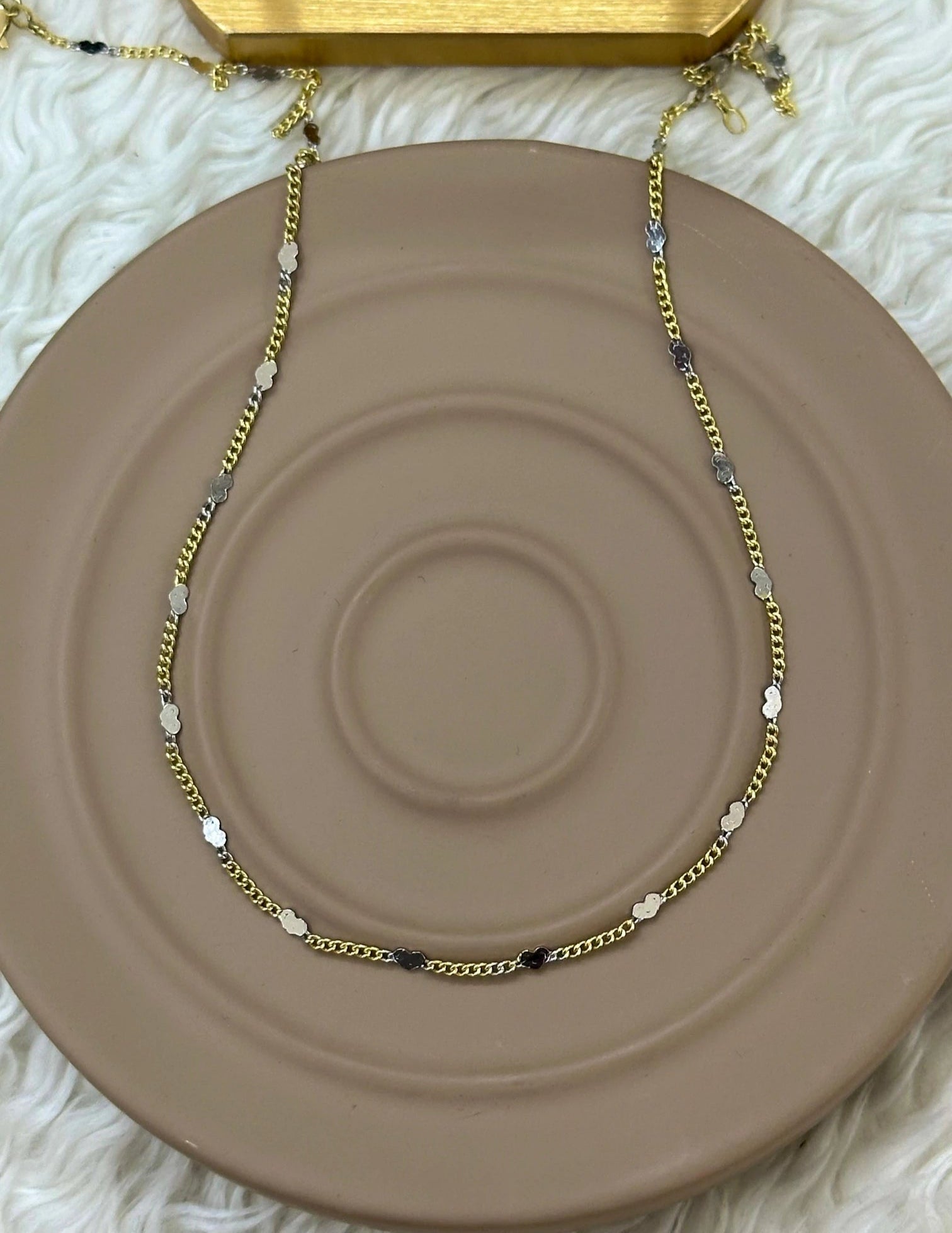 xuping’in özel tasarımı olan bu zarif kolye, altın renkli zincir üzerinde gümüş renkli küçük çiçek motifleriyle detaylandırılmıştır. Hem gümüş hem de gold tonlarının birleşimiyle modern ve şık bir görünüm sunar. Günlük kullanıma uygun, hafif ve zarif yapısıyla stilinizi tamamlayacak ideal bir aksesuar.