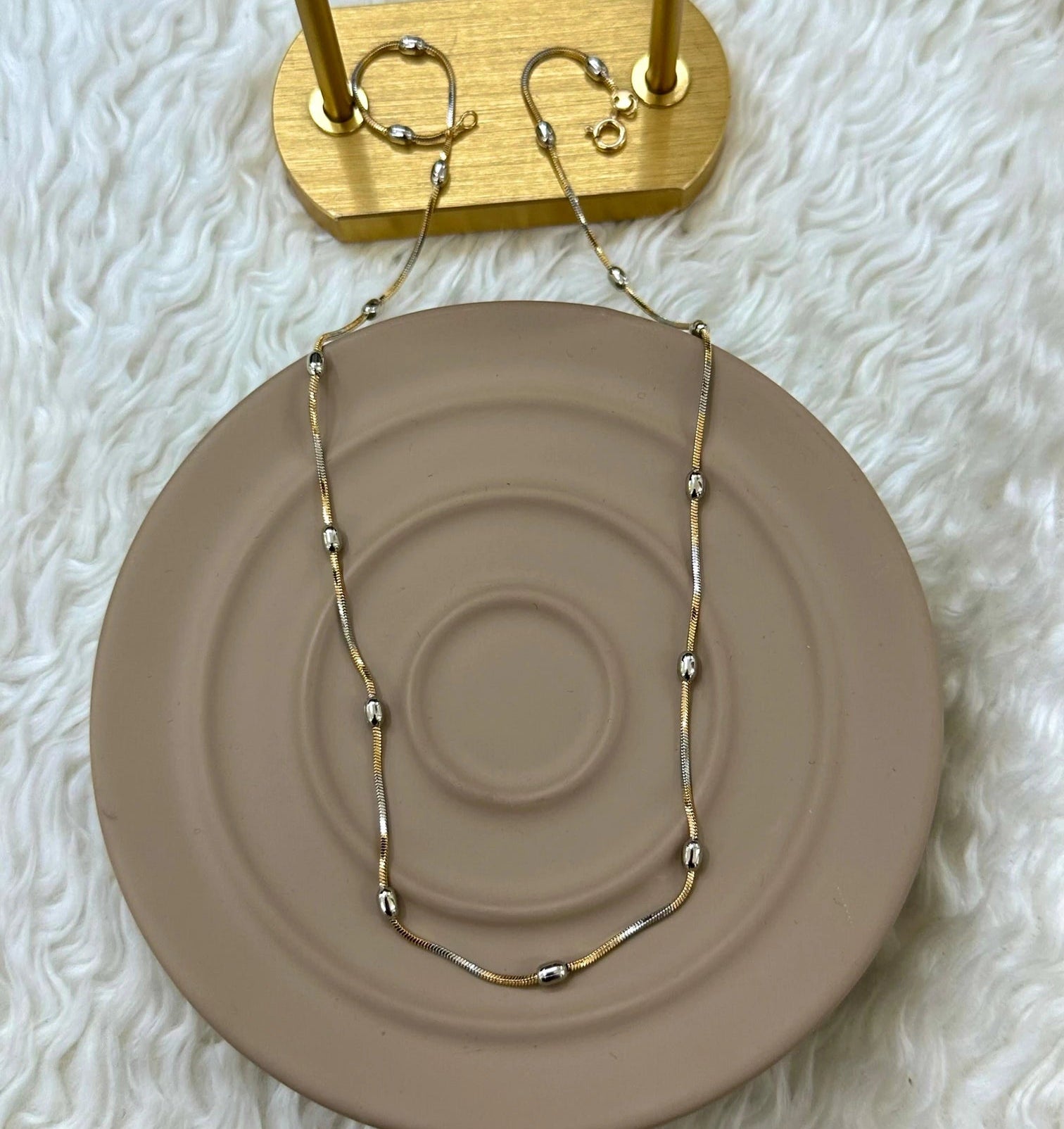 Altın ve gümüş renklerinin uyumu ile şıklık katarken, top detayları parçaya sofistike bir hava kazandırır. Hem günlük kullanıma hem de özel davetlere uygun olan bu kolye, kaliteli malzemesiyle uzun süre dayanıklı ve parlak kalır. Kombinlerinize tamamlayıcı ve estetik bir dokunuş sağlayacak bu set ile tarzınızı ön plana çıkarın.