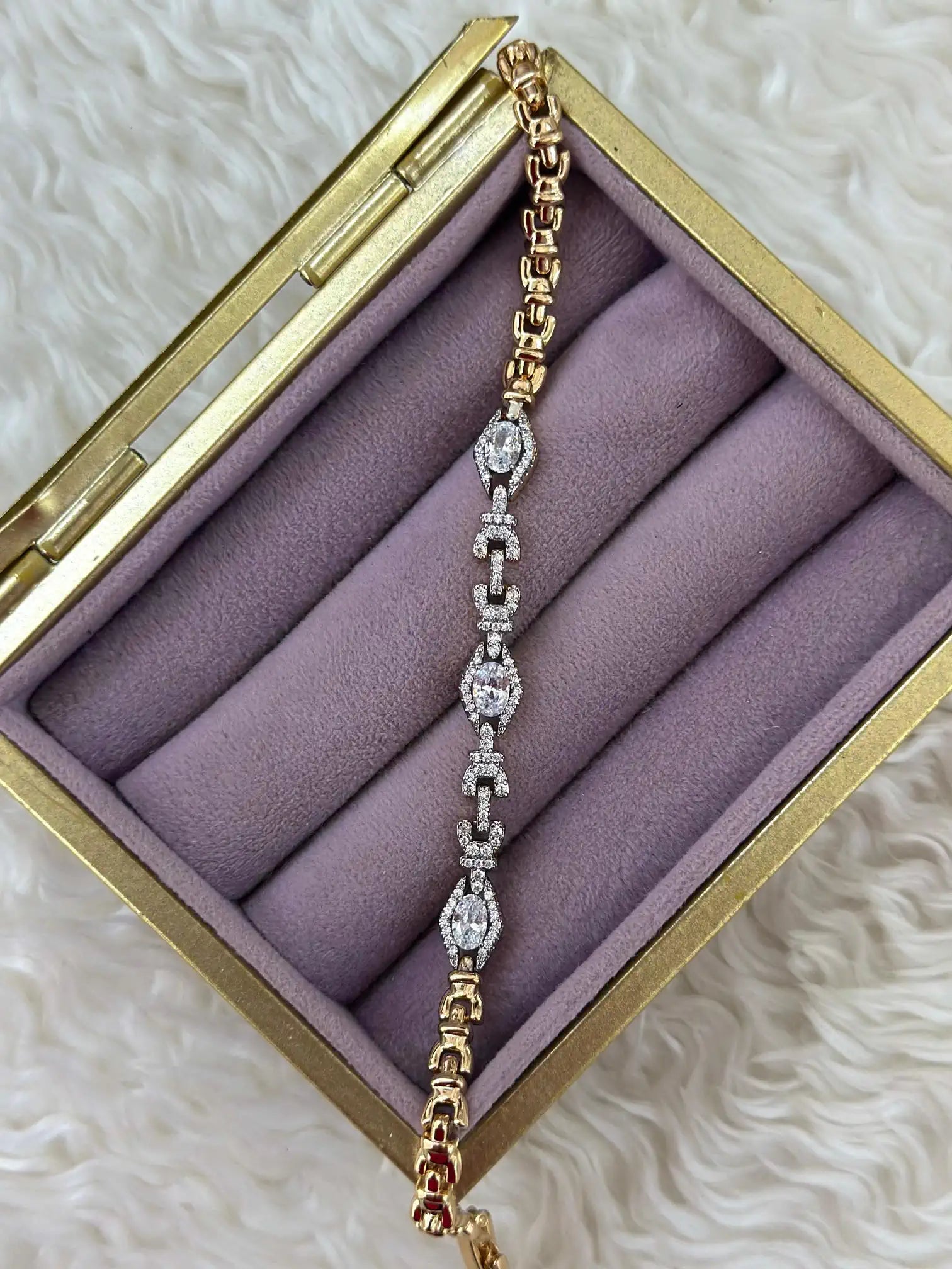 Şıklığın modern yorumu olan bu Xuping bileklik, kenarlarında zarif taş detaylarıyla çevrili, ortasına doğru yoğunlaşan tektaş ve sıra taş dizilimleriyle göz kamaştırıyor. Altın kaplama yüzeyi ve kaliteli işçiliğiyle uzun ömürlü kullanım sağlar. Hem özel günlerde hem de günlük kombinlerde stilinize zarif ve ışıltılı bir dokunuş katacak bu bileklik, modern tasarımıyla koleksiyonunuzun vazgeçilmezi olacak.