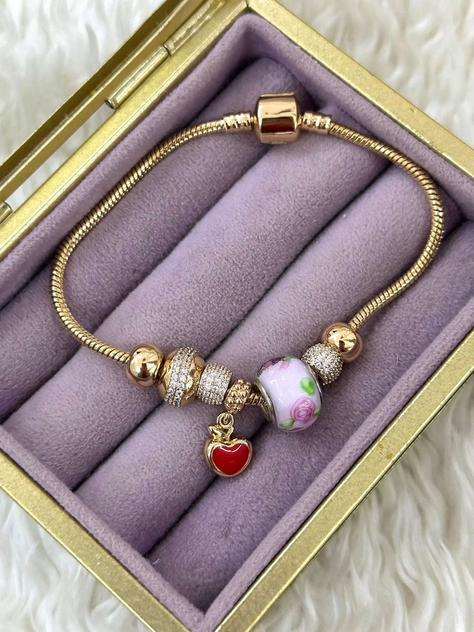 Xuping markasının şık charm bilekliği, altın kaplama ince zincir üzerine yerleştirilmiş farklı renk ve desenlerde boncuklarla tasarlandı. Bileklik üzerindeki kırmızı, beyaz ve mor tonlarıyla dikkat çeken boncuklar; taşlı detaylar ve kırmızı elma figürü ile zenginleştirilmiş. Günlük ve özel kullanım için ideal olan bu bileklik, zarif ve özgün tasarımıyla stilinizi tamamlar.