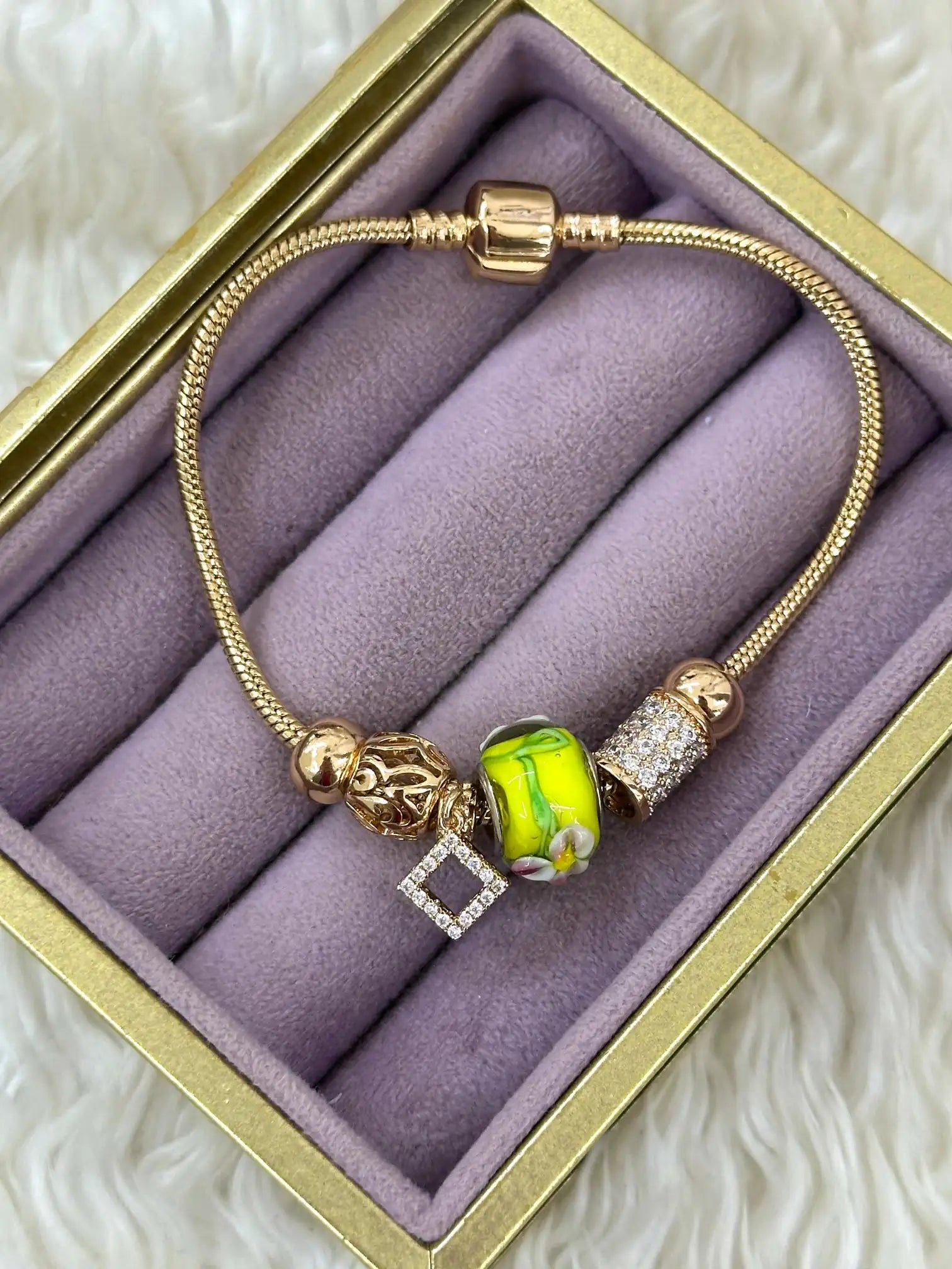Bilekliğin rose gold kaplama metal yüzeyi, hem dayanıklılığı hem de parıltısıyla göz kamaştırıyor. Üzerindeki boncuklar, farklı renk ve dokularda tasarlanarak bilekliğe canlılık ve hareket katıyor. Charmlar ise her biri ayrı anlam taşıyan, özenle işlenmiş detaylar sunuyor; böylece bileklik sadece bir aksesuar değil, aynı zamanda kişisel tarzınızı yansıtan özel bir parça haline geliyor.