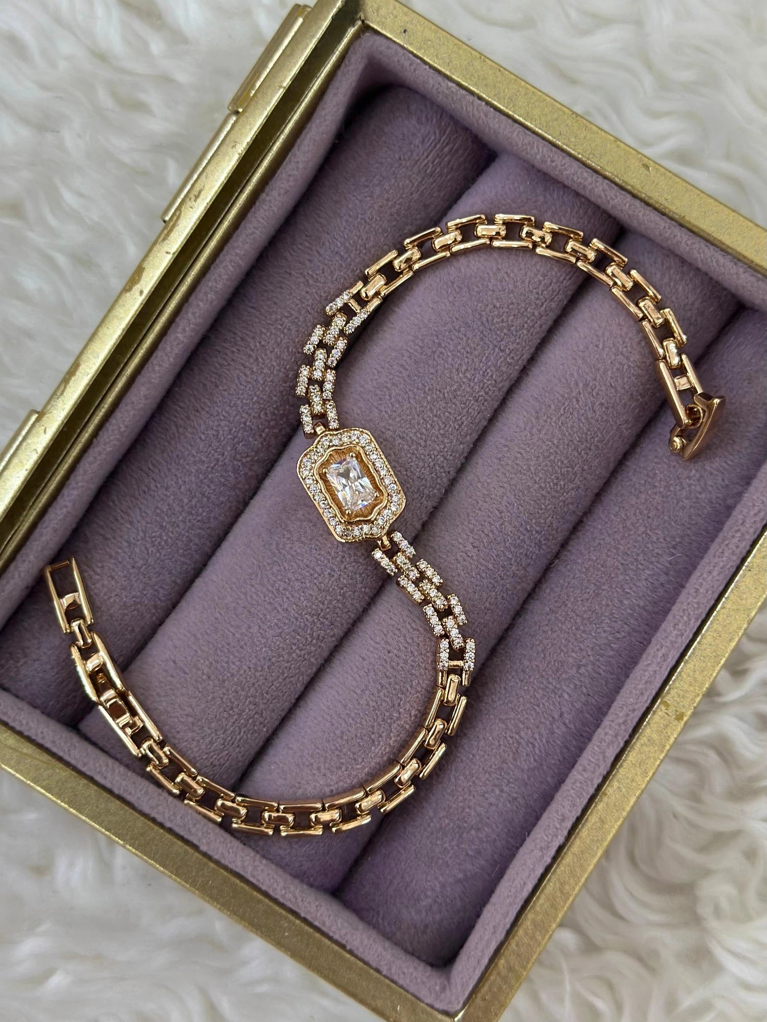 Xuping'in zarif tasarımıyla hazırlanan bu rose gold bileklik, çift sıra taşlı zincirlerle bezenmiştir. Ortasında yer alan büyük baget taş, bilekliğe şıklık ve zarafet katar. İnce işçilik ve kaliteli malzeme ile üretilen bu bileklik, özel günlerde ve günlük kullanımlarda tarzınızı tamamlayacak modern ve gösterişli bir aksesuardır. Parlak taş detaylarıyla dikkat çeken model, göz alıcı bir görünüm sunar.