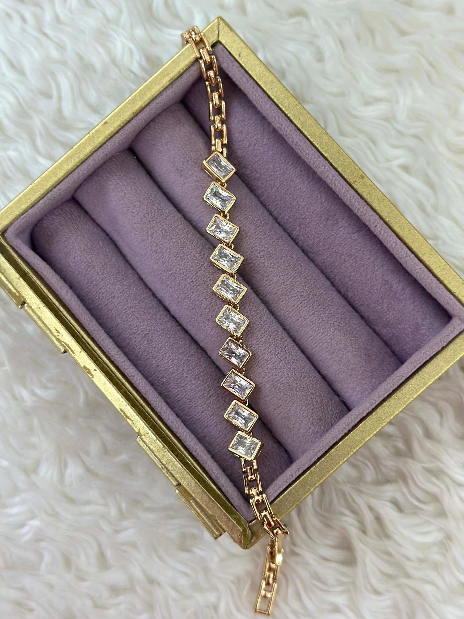 Zarif tasarımı ve ışıltılı taşlarıyla öne çıkan bu kare zincir bileklik, her ortamda şıklığınızı tamamlayacak. Altın kaplama yapısı sayesinde dayanıklı ve uzun ömürlüdür. Zincir detayları ve keskin taş yerleşimi, bileğinize modern ve sofistike bir dokunuş katıyor. Günlük kullanımda ve özel davetlerde stilinizi yansıtmak için ideal bir aksesuar. Her kadının takı koleksiyonunda bulunması gereken, zamansız bir parça.