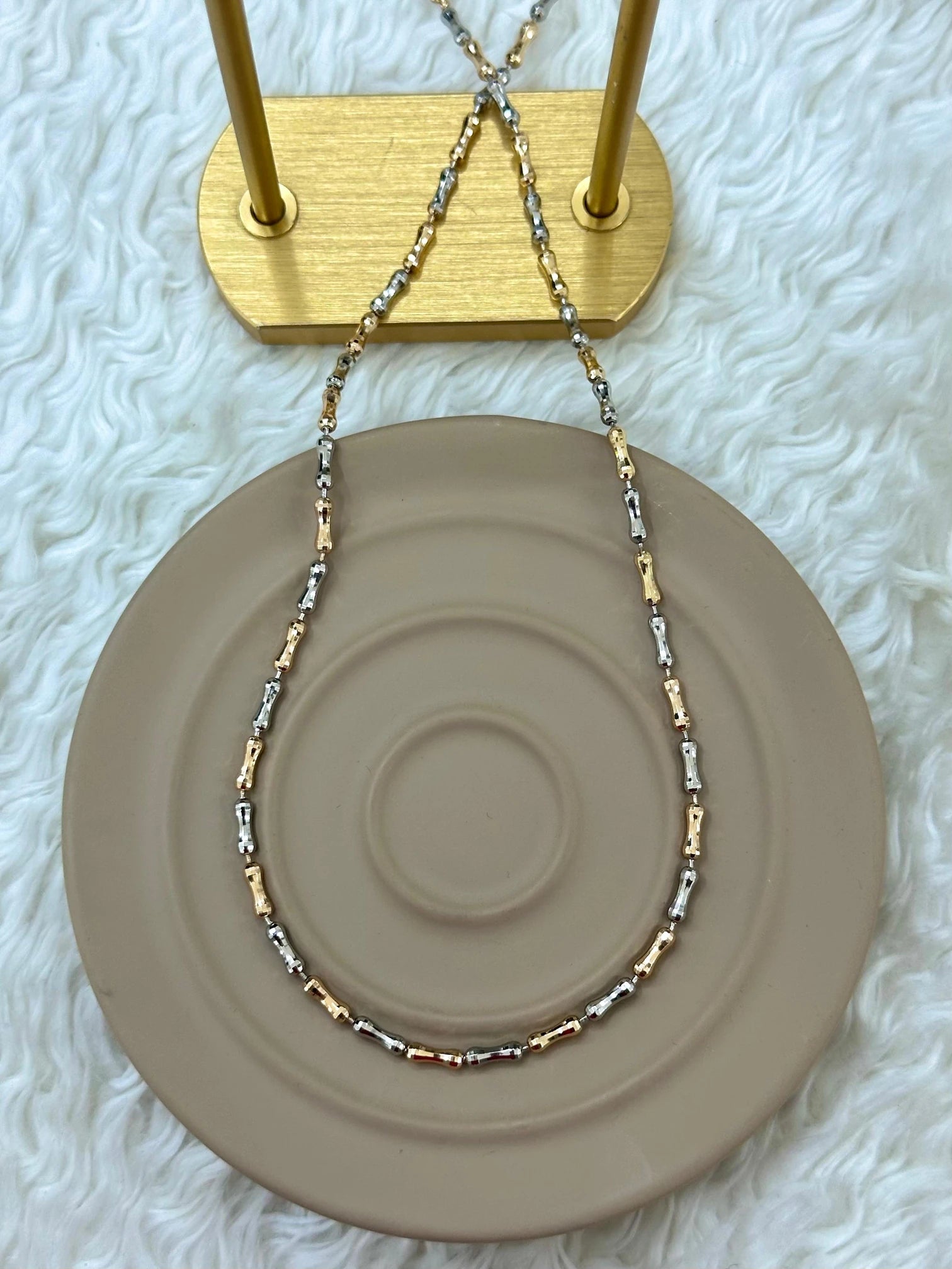 Zarif tasarımıyla öne çıkan üç renkli altın zincir kolye, gümüş, sarı ve rose altın renklerinin uyumunu bir arada sunar. Hem günlük kullanımda hem de özel davetlerde stilinizi tamamlayacak şık bir aksesuar. Hafif yapısı ve kaliteli işçiliği sayesinde konforlu bir kullanım sağlar. Zamansız tasarımıyla her gardırobun vazgeçilmezi olacak bu kolye, farklı renk tonlarıyla kişisel tarzınızı yansıtmanıza olanak tanır.