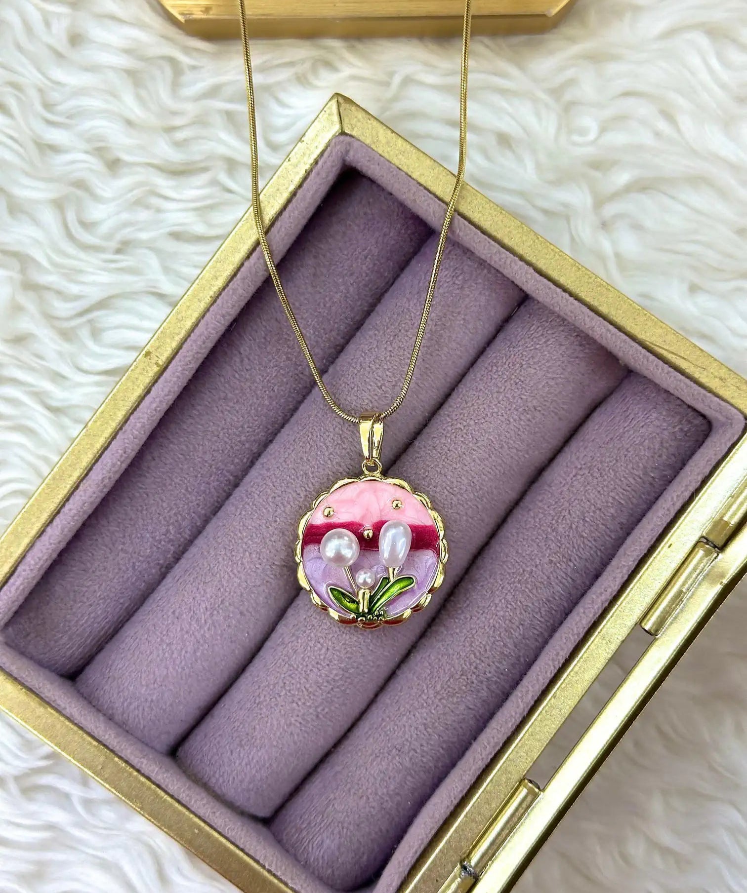 Özel tasarım pembe ve mor tonların uyumuyla oluşturulmuş bu zarif kolye, içindeki doğal inciler ve minyatür çiçek figürleriyle büyüleyici bir görünüm sunar. Altın kaplama çerçevesiyle kombinlenen bu romantik aksesuar, günlük şıklığınıza feminen ve naif bir dokunuş katmak için ideal bir seçimdir. İnce işçilik ve kaliteli malzemesiyle uzun yıllar severek kullanabileceğiniz, her anınıza zarafet katan bir parça.
