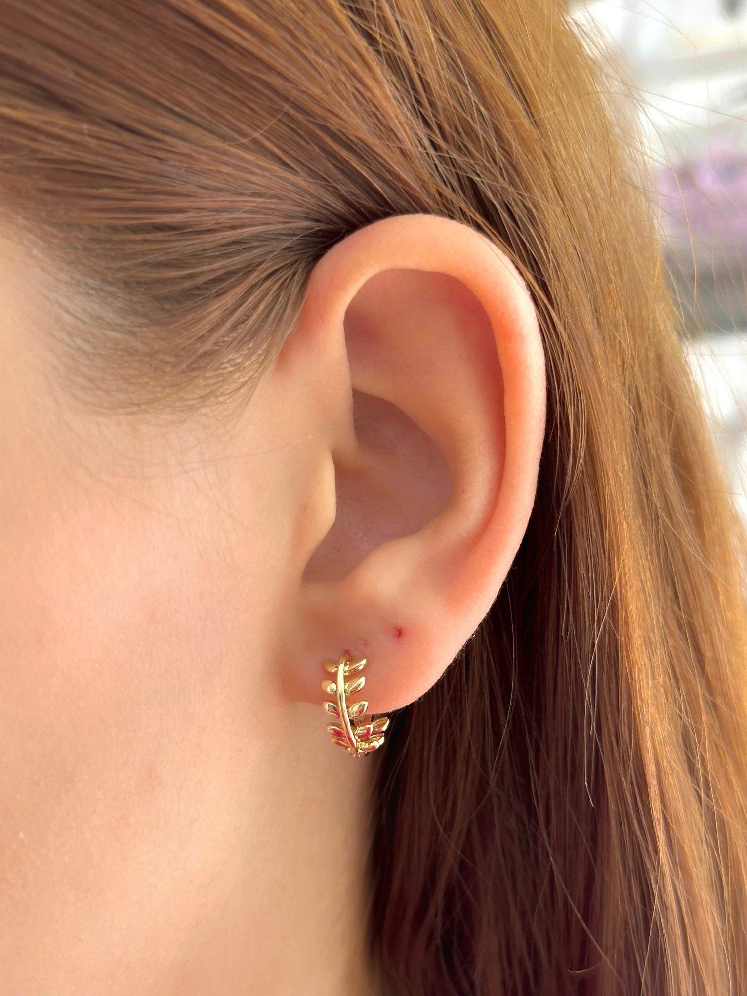 Doğadan ilham alan yaprak dallı formuyla kulağa zarif bir dokunuş katan mini halka. ✨ Parlak gold tonu ile sıcak bir ışıltı verir; iğneli–kelebek kilidi sayesinde pratik ve güvenli kullanım sunar. Tek başına şık, çoklu piercing kombinlerinde harika tamamlayıcı! 🌿